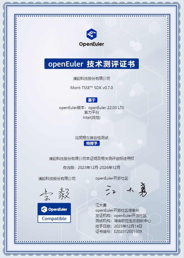 | Mont-TSSE® SDK | OpenEuler | 认证证书 |
